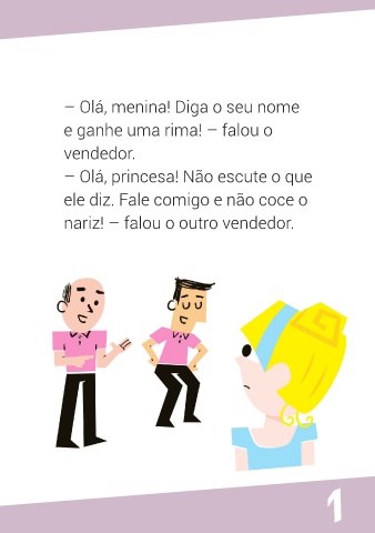 – Olá, menina! Diga o seu nome e ganhe uma rima! – falou o vendedor. – Olá, princesa! Não escute o que ele diz. Fale comigo e não coce o nariz! – falou o outro vendedor. 1